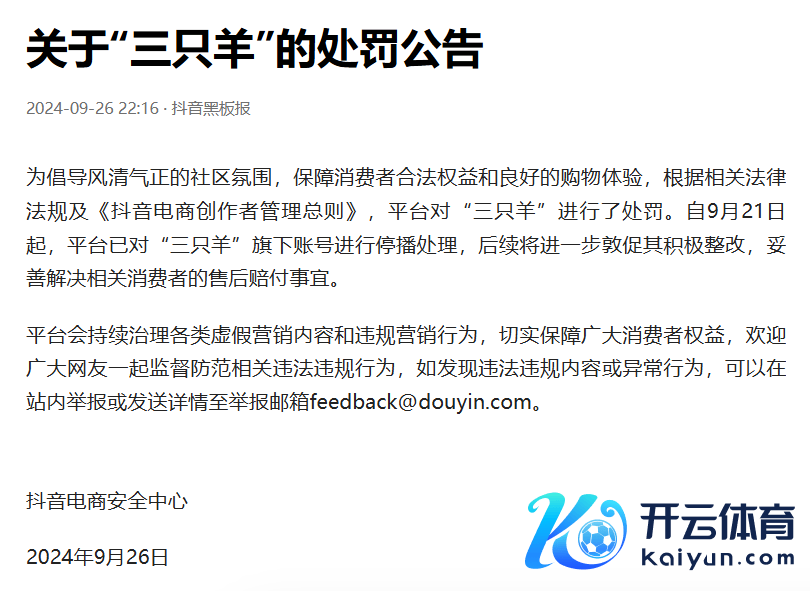 本日,抖音电商安全中心亦发布公告称,为倡导风清气正的社区氛围,保险破钞者正当权利和邃密的购物体验,说明掂量法律王法及《抖音电商创作家顾问总则》,平台对“三只羊”进行了处罚。自9月21日起,平台已对“三只羊”旗下账号进行停播处理,后续将进一步敦促其积极整改,妥善惩处掂量破钞者的售后赔付事宜。