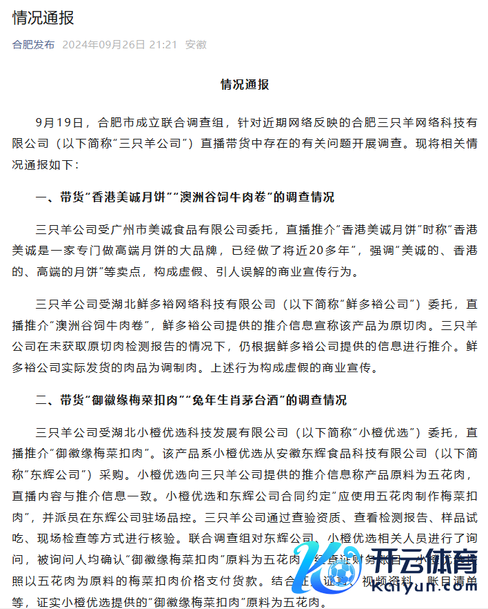 本年9月,三只羊鸠集科技有限公司因在直播中涉嫌“误导破钞者”等行径,被监管机构立案探询。9月26日合肥市连系探询组发布情况通报,依据《行政处罚法》《反不正派竞争法》等掂量规章,拟决定对三只羊公司充公违法所得、罚金缱绻6894.91万元。针对三只羊公司直播带货中存在的掂量问题,责令暂停磋商限期整改,承担掂量法律包袱。对在使命经由中左计失责的单元和掂量东谈主员,纪检监察部门将立案探询,照章依规严肃处理。