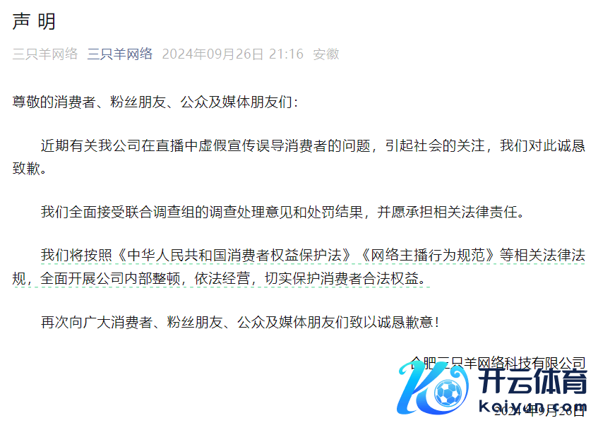 随后,三只羊公司发布声明,就近期公司在直播中缺点宣传误导破钞者的问题致歉。该公司称,将全面接管连系探询组的探询处理想法和处罚效果,并愿承担掂量法律包袱;将按照《中华东谈主民共和国破钞者权利保护法》《鸠集主播行径设施》等掂量法律王法,全面开展公司里面整顿,依王法划,切实保护破钞者正当权利。