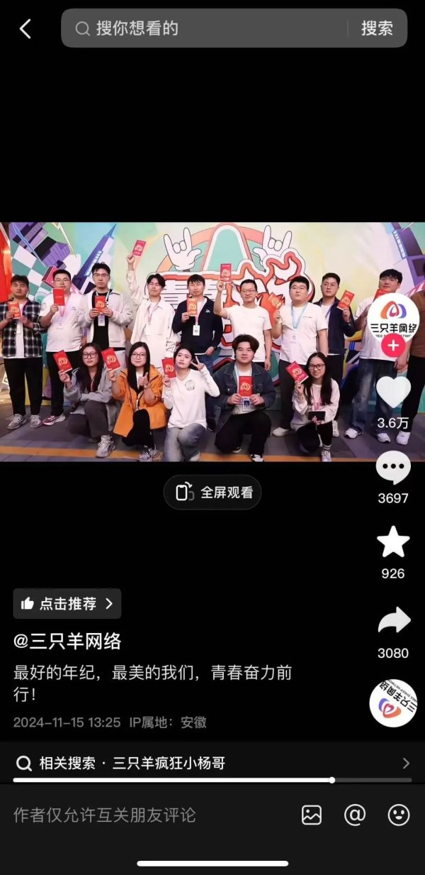 11月15日,三只羊鸠集归附更新,共享了一支公司宣传片,配文:“最佳的年龄,最好意思的咱们,芳华勇猛前行”。三只羊首创东谈主大杨哥、小杨哥并未出目下这段视频中,完结目下,猖狂小杨哥、猖狂大杨哥等账号暂未更新。