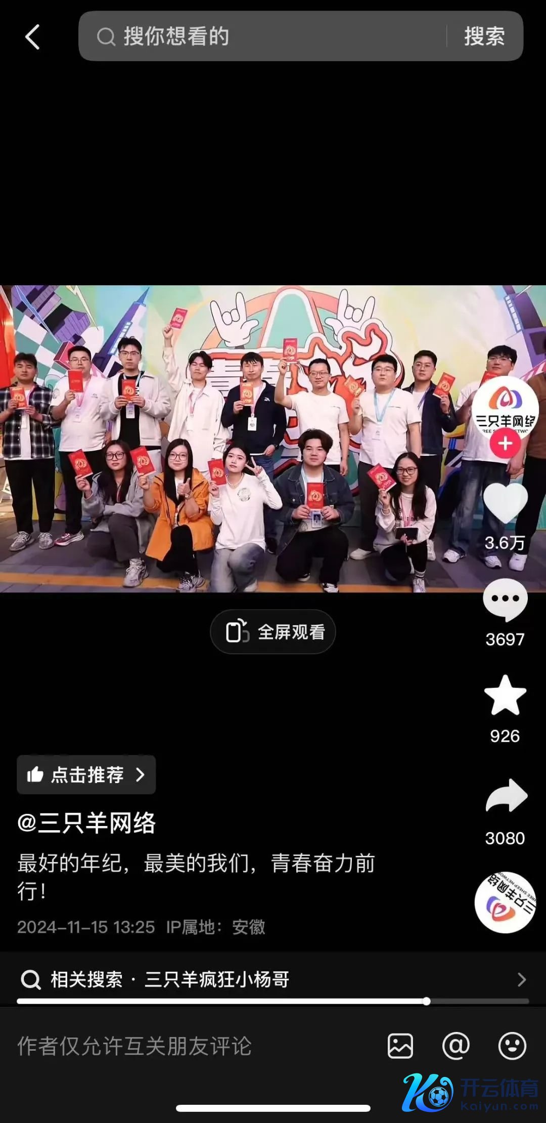三只羊鸠集归附更新凯时体育游戏app平台。 11月15日,三只羊鸠集归附更新,共享了一支公司宣传片,配文:“最佳的年龄,最好意思的咱们,芳华勇猛前行”。三只羊首创东谈主大杨哥、小杨哥并未出目下这段视频中,完结目下,猖狂小杨哥、猖狂大杨哥等账号暂未更新。 目下,该条视频获利了向上3.6万点赞、3600条批驳,不外,记者留神到,三只羊鸠集已将该视频批驳建造为仅允许互关一又友批驳。据新黄河微博音书称,此前该视频批驳曾向上3900条。 记者看到,三只羊鸠集的上一条视频是在9月26日。 本年9月,三只羊