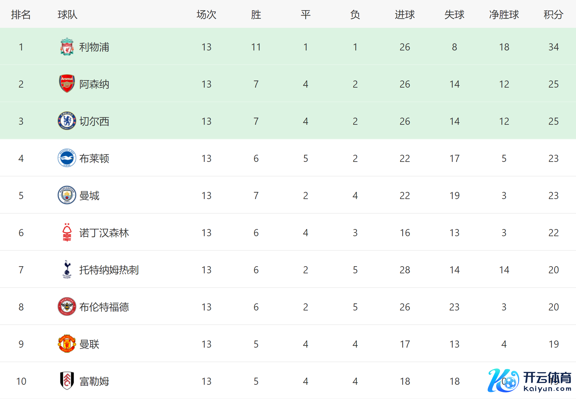 北京本事12月1日晚到2日凌晨,本赛季英超第13轮戒指了多场比赛,利物浦主场2-0打败曼城,曼联主场4-0狂胜埃弗顿,切尔西主场3-0大捷维拉,接下来望望各队最新积分榜名次情况:利物浦9分上风领跑,另外名轮番二的阿森纳积25分欧洲杯体育,不外擢升第六的诺丁汉丛林只好3分。 利物浦VS曼城 上半场,利物浦依靠加克波的破门,暂时1-0擢升,另外范迪克头球中柱,曼城这边只好1次射门莫得打正,也莫得角球契机,险些被压着打。 下半场,利物浦短短16分钟贯穿错失3次良机之后,因曼城无理送点,萨拉赫点射打进