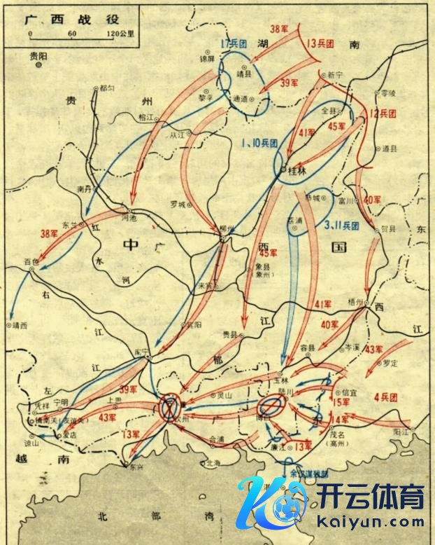 自11月7日起,中国东说念主民目田军聚会重兵,包括二野四兵团和四野第十二、十三兵团,算计四十五万雄兵,分兵三路,向广西发起狡猾迫切。