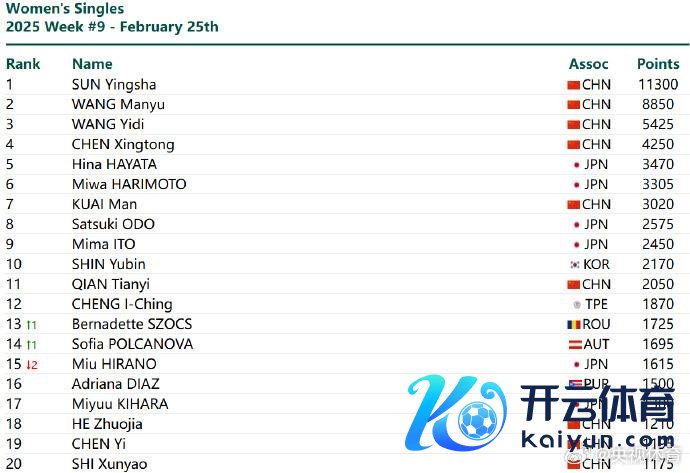 国外乒联公布2025年第9周寰宇排名尊龙体育网。 男人单打,中国队球员林诗栋、王楚钦、梁靖崑位列前三。 雨果·卡尔德拉诺排名飞腾1个排行位列第5;泛好意思洲杯男单冠军卡纳克·贾哈排名飞腾19个排行位列第26;黄友政排名飞腾8个排行位列第46;WTT支线赛卡帕多西亚站男单冠军徐瑛彬排名飞腾16个排行位列第62。 其他中国队球员,林高远排名第11,向鹏排名第22,陈垣宇排名第27,薛飞排名第38,周启豪排名第39。 女子单打,中国队球员孙颖莎、王曼昱、王艺迪、陈幸同位列前四,蒯曼位列第七。 泛好意